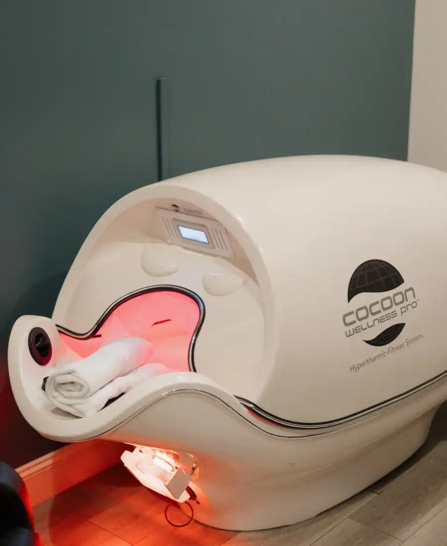 Many of the benefits come from the infrared lighting, which deliver a dry heat treatment that feels like a dry sauna. Infrared heat has been proven to assist in weight loss. What are your needs? Or what are you looking to achieve from this service? There are 5 Programs that include, Power Nap, Wellness, Relax, Fitness & Weight Management Most Reported Benefits: General wellness system that is part of a healthy lifestylePromotes relaxation & Stress managementMaintain weight management or assist with weight loss goalsImproved mental acuityAssists in firming, toning, and improving physical fitnessPromotes healthy lifestyle sleep management choicesCustomized vibration massage How does it work? The Cocoon Wellness Pro Pod also delivers a full-body vibration massage. You are able to target areas of the body to be massaged, as well as adjust the intensity, creating an experience that is uniquely yours. In addition to the infrared heat and vibration massage, the Cocoon Wellness Pro Pod has the unique option to add aromatherapy to your experience. The three levels of near, mid and far- infrared heat with convection air heating work to deliver a dry heat that can be set form ambient to 192 degrees Fahrenheit. This duel heating system is similar to stepping into a dry sauna. The sweat induced by infrared and dry heat exposure adds many wellness benefits to the body.